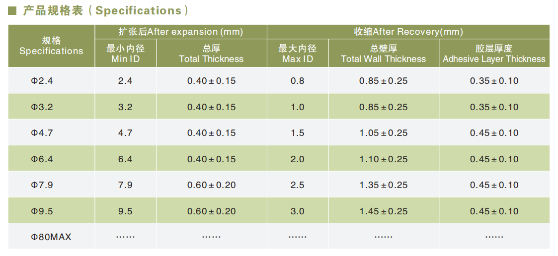 双壁热收缩套管是一种内层附有热熔胶的半柔性热缩管, 外层是由辐射交联聚烯烃组成,内层是专门设计的胶性内 壁;加热时内壁熔融并随外壁收缩填充孔隙或缝隙,冷却 后,双壁管壁厚均匀、坚实。广泛应用于电子设备的接线 防水,电线分支处的密封固定金属管线的防腐保护,以及防止 由高分子链松弛产生的松动和脱落,如水下灯饰、汽车油 管、高级线束等。 Double wall heat shrinkable sleeve is a semi flexible heat shrinkable tube, inner layer with hot meltadhesive, the outer layer is made of irradiation crosslinked polyolefin. The inner wall is specially designed that colloidality when heated, the inner wall is melted and the pores or gaps are filled with the outer wall, after cooling, double wall thickness is uniform and solid. Widely used in electrical equipment, wire and cable, wire branch of the seal, metal pipeline corrosion protection, as well as prevent the loose and falling off from the polymer chain relaxation. Such as underwater lighting, automotive tubing, advanced wire harness, etc.